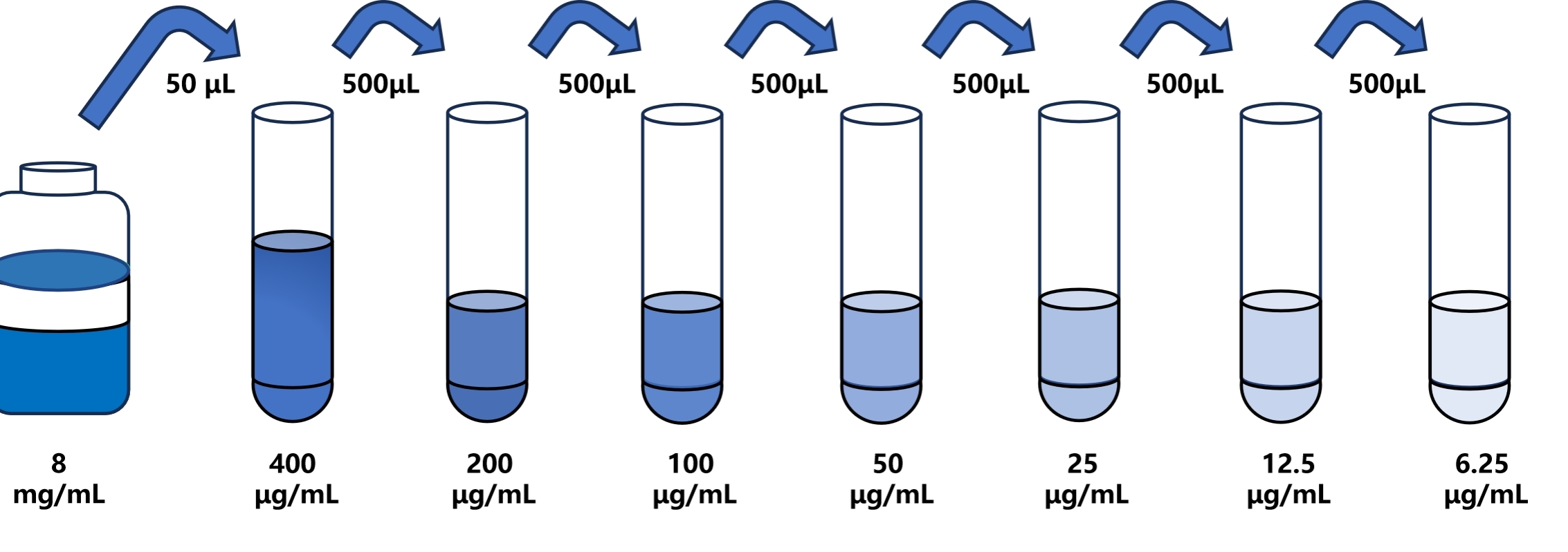 试剂盒中取出标准品,准备7个试管,先从8mg/mL标准品(200μL)按需吸取一定量用1×稀释液稀释至400μg/mL(例:50μL的标准品母液+950μL的1×稀释液,制备得到1000μL的400μg/mL浓度标准品),随后在6个试管中分别加入500μL的1×稀释液,在这6个单独的试管中将400μg/mL标准品依次2倍倍比稀释至6个梯度,共配制7个浓度的标准品,依次为:400μg/mL、200μg/mL、100μg/mL、50μg/mL、25μg/mL、12.5μg/mL、6.25μg/mL,从最高浓度标准品溶液中吸取500μL标准品到下一个试管中,轻轻吹打混匀,以此类推进行标准品的倍比稀释(如图所示),1×稀释液用作零浓度标准品(0μg/mL)。